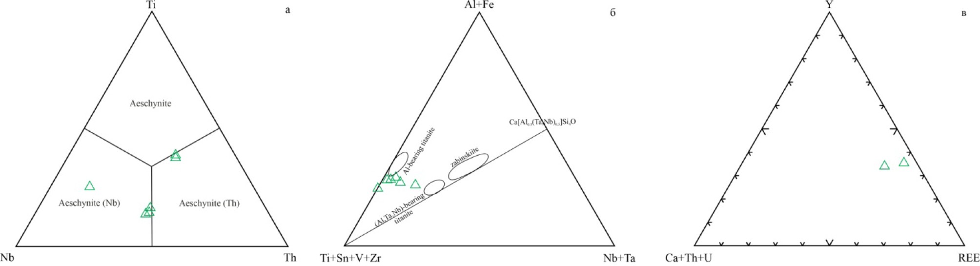 Figure 3. Classification diagrams: a) Nb-Ti-Ta for aeschynite; б) (Ti+Sn+V+Zr)-(Al+Fe)-(Nb+Ta) for titanite; в) (Ca+Th+U)-Y-REE for fergusonite.