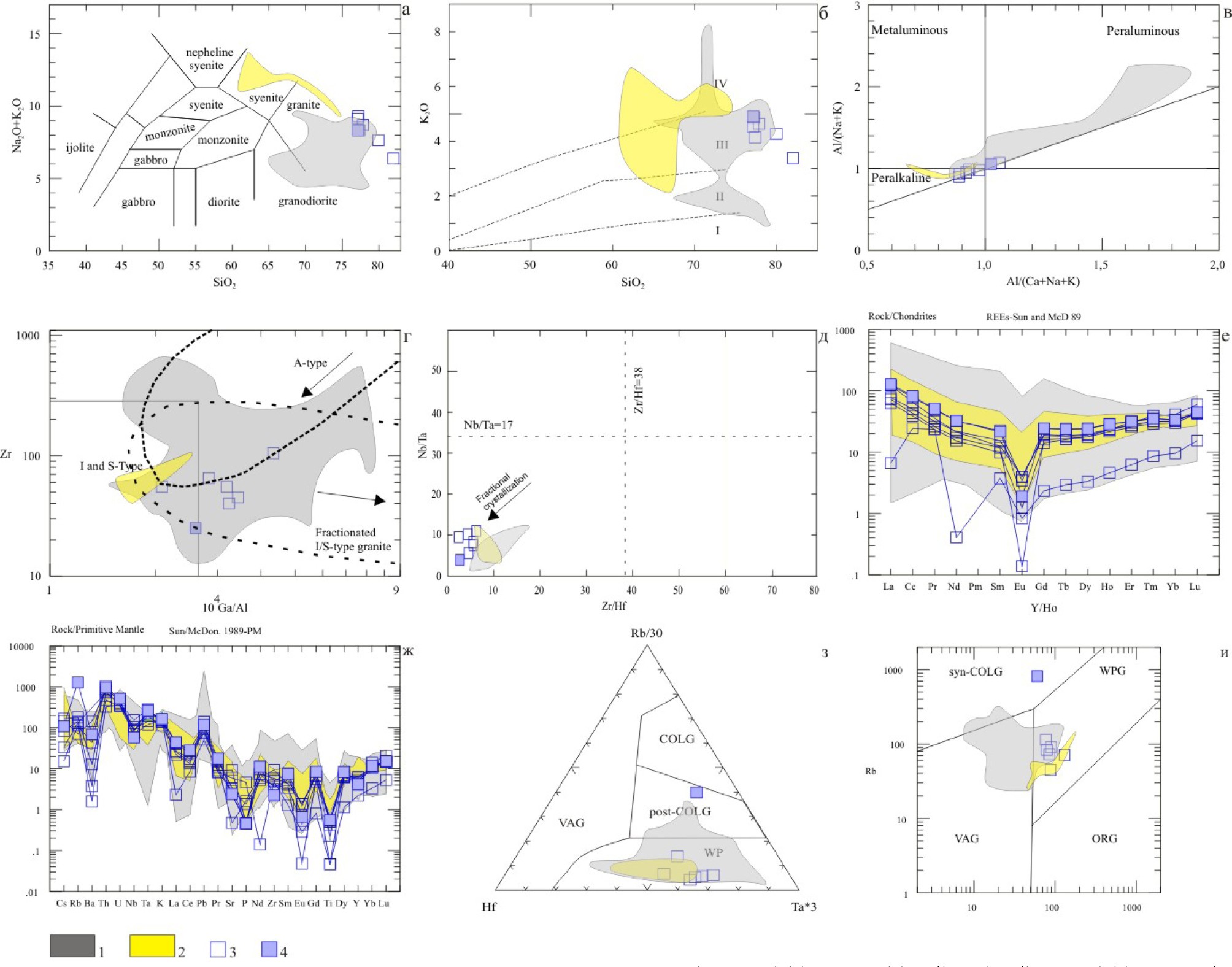 Породы относятся к семействам гранитов, лейкогранитов умеренно-щелочного ряда. Наблюдаемые постепенные переходы не позволяют отнести породы к разным сериям. Биотитовые граниты относятся к I-типу, лейкограниты – к А-типу. Геохимическая типизация гранитоидов (используемая при геодинамических реконструкциях) неоднозначна, часть точек составов попадает в поле внутриплитных образований, часть – в поле позднеколлизионных и постколлизионных [5–7].