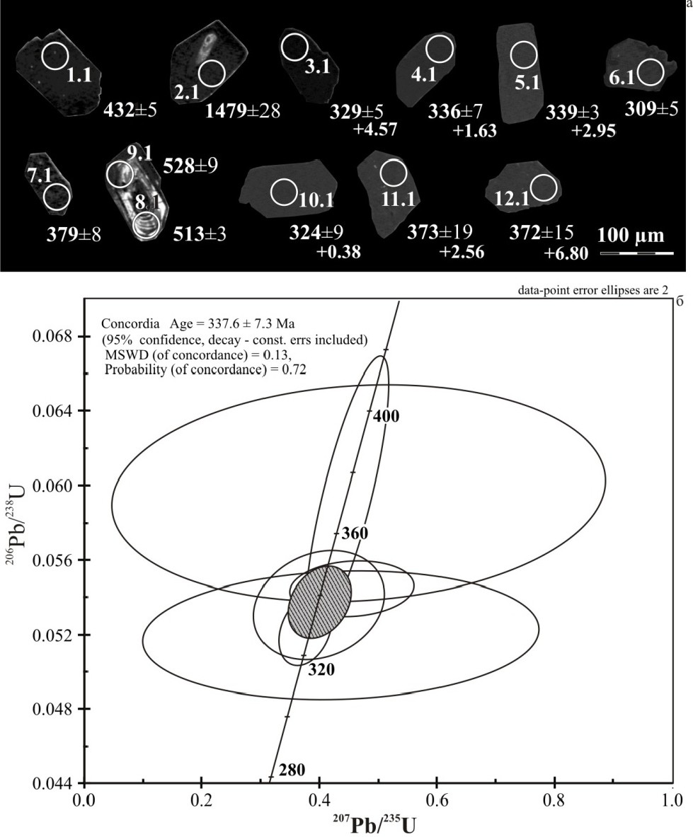 Возраст цирконов по отношению 206Pb/238U определен в шести точках (рис. 5 б), диапазон возрастов составил 373–324 млн лет. Рассчитанный средневзвешенный возраст – 337,6±7,3 млн лет (СКВО=0.13).