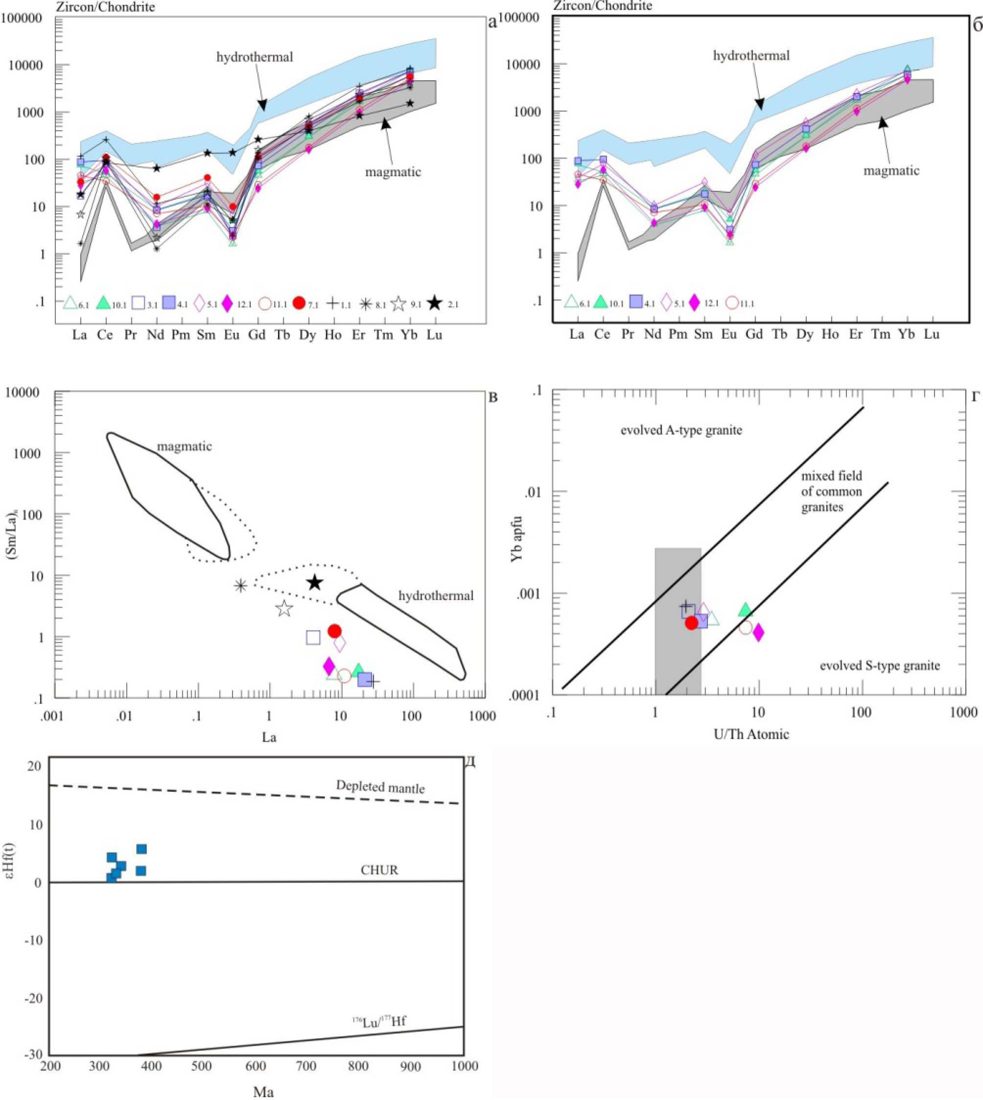 Рисунок 6. Спектры распределения РЗЭ в продатированных цирконах (а), cпектры распределения РЗЭ в (серых в CL), «ажурных», «сетчатых», «пористых» (б), график La–(Sm/La)n (в), диаграмма U/Th–Yb для разделения цирконов [29]. Серое поле показывает область состава цирконов обычных гранитов, согласно [30] (г), диаграмма εHf(t)–Возраст (млн лет) для продатированных цирконов (д).