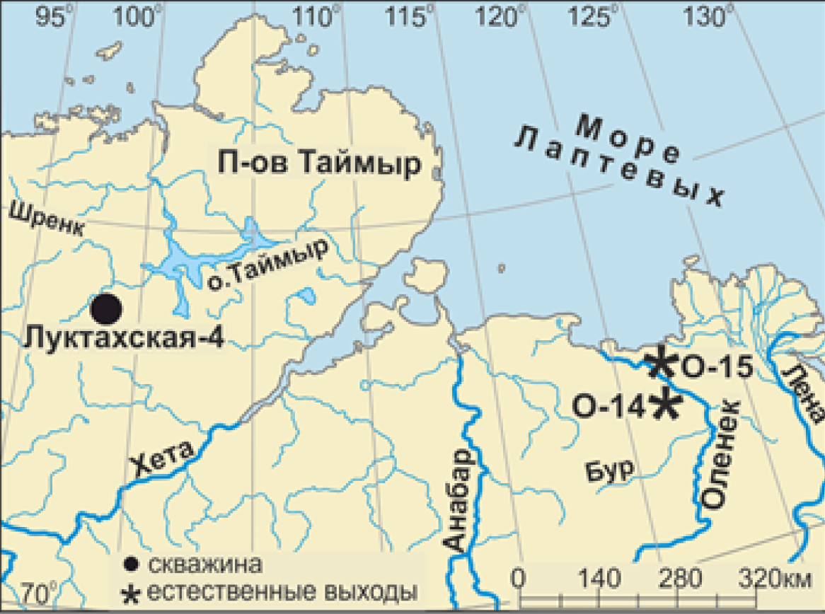 Материалом для стратиграфического и биофациального исследований послужили коллекции фораминифер нижнего мела, полученные в результате обработки образцов из бореального берриаса – готерива скважины Луктахская-4 (Центральный Таймыр, сборы Б. Л. Никитенко, Л. А. Глинских, 2003) и естественных выходов на р. Оленек (обнажения О-14, О-15, сборы Б. Л. Никитенко, 2009, 2010) (рис. 1). Всего было изучено 80 образцов, насчитывающих несколько тысяч раковин фораминифер хорошей и удовлетворительной сохранности.