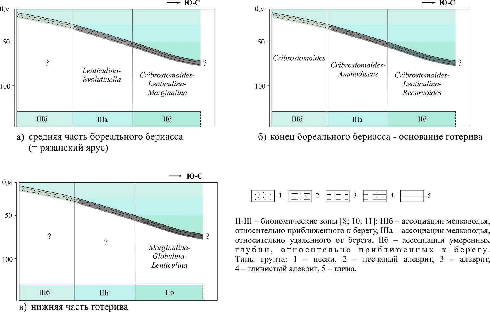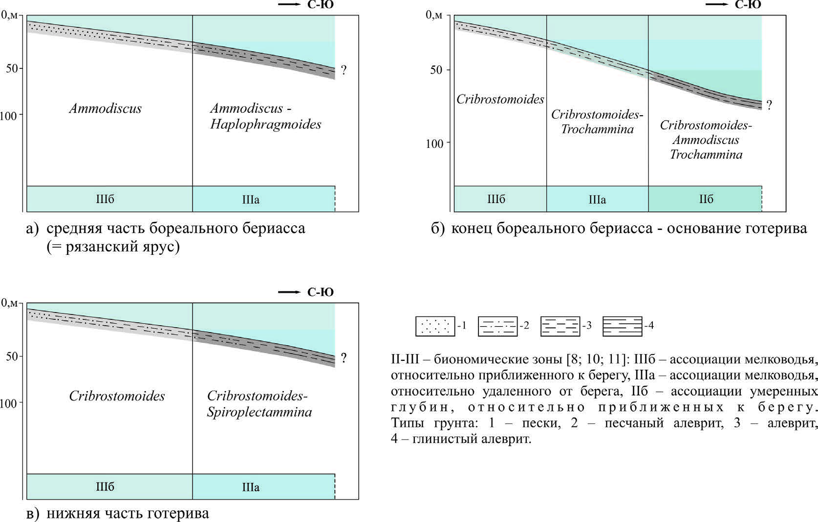 В конце бореального берриаса – начале готерива на территории Енисей-Хатангского пролива (Центрального Таймыра) и Северо-Сибирского моря (район нижнего течения р. Оленек) на алевритистых, алеврито-песчанистых грунтах обитали моновидовые сообщества агглютинирующих фораминифер рода Cribrostomoides, характерные для прибрежно-мелководной зоны моря (биономическая зона IIIб) (рис. 2–5).