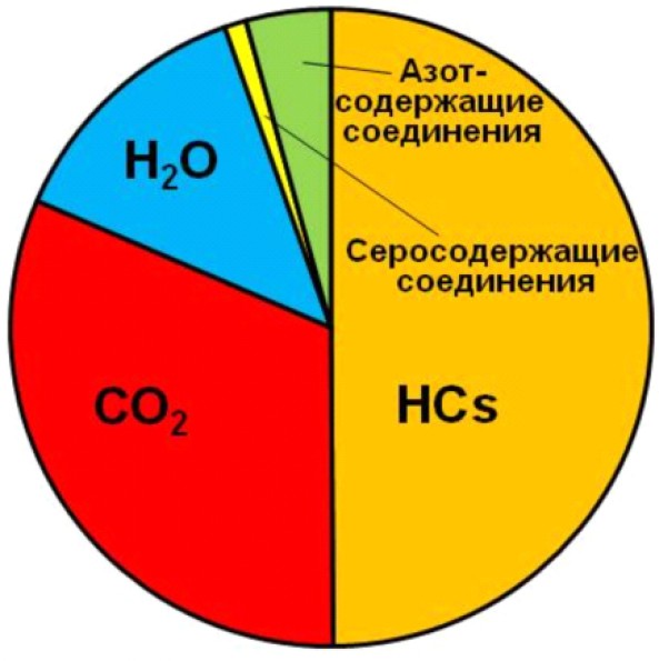 Figure 7. Relative content of hydrocarbons (HCs), carbon dioxide (CO2), water (H2O) and nitrogen- and sulfur-containing compounds from fluid inclusions in a copper nugget from the Taymet deposit, according to [10].