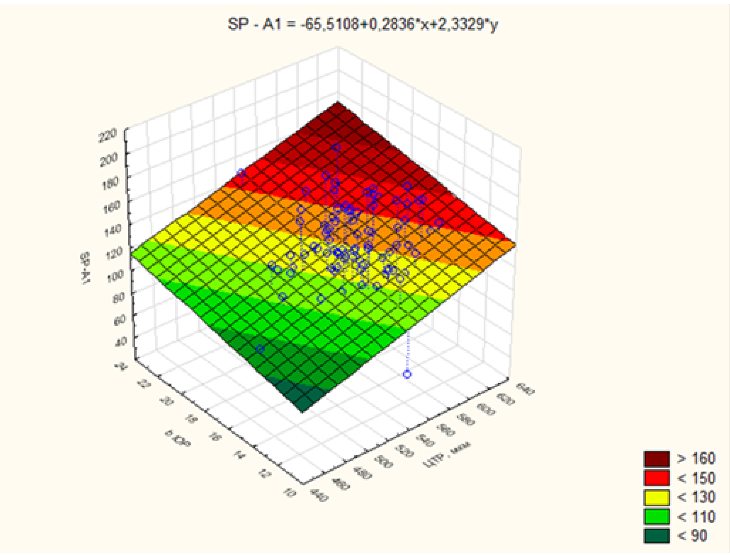 На основании многофакторного регрессионного анализа установлена зависимость между показателем жесткости роговицы SPA1, минимальной толщиной роговицы (ЦТР) и биомеханически компенсированным ВГД (bIOP), которая характеризовалась формулой: