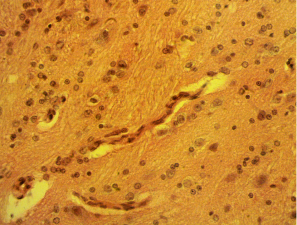Моделировалась ЧМТ путем нанесения удара металлическим грузиком 68 г с высоты 90 см в теменно-затылочную область с помощью специального устройства. Энергия воздействия при этом составила 0,6 Дж. Через трое суток животных под наркозом выводили из эксперимента. Суправитально кровеносные сосуды части крыс инъецировали взвесью черной туши в 10%-м растворе нейтрального формалина в соотношении 1:4 через брюшную аорту. Затем проводилась декапитация, череп освобождался от мягких тканей и погружался в 10%-й нейтральный раствор формалина на 3 дня. Затем мозг с мозжечком извлекался из полости черепа, проводился по спиртам возрастающей концентрации, заливался в парафин. Из парафиновых блоков готовились гистологические срезы толщиной 5–7 мкм, окрашивались гемотоксилином-эозином и пирофуксином по Ван-Гизону. Готовые препараты изучались под микроскопом OlympusB×40 (Япония). Одновременно проводились серийное микрофотографирование с помощью цифрового фотоаппарата, сопряженного с оптической системой микроскопа и компьютером, морфометрия и протоколирование результатов.