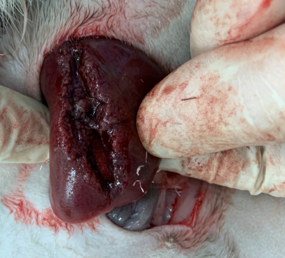 Экспериментальная модель кровоточащей раны печени: под внутривенным обезболиванием (золетил 100 – 0,1 мл/кг массы тела, ксилавет – 0,1 мл/кг массы тела) лабораторным кроликам выполнялась срединная лапаротомия. В рану выводилась правая доля печени, которую помещали на подставку-столик. На расстоянии 20 см от поверхности печени с помощью нити крепился металлический груз в виде треугольной призмы массой 92 г. По готовности нить, фиксирующая груз, пережигалась пламенем газовой горелки, груз падал в вертикальном направлении и ударялся о поверхность правой доли печени, что приводило к формированию экспериментальной кровоточащей раны печени, локализующейся в области правой доли, линейной формы, размером 3,0 × 0,7 см, глубиной 0,6 см, с неровными краями и активным паренхиматозным кровотечением из области краев раны (рис. 1).
