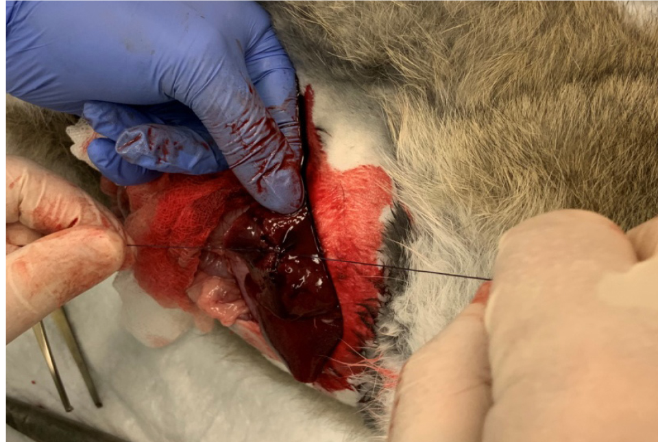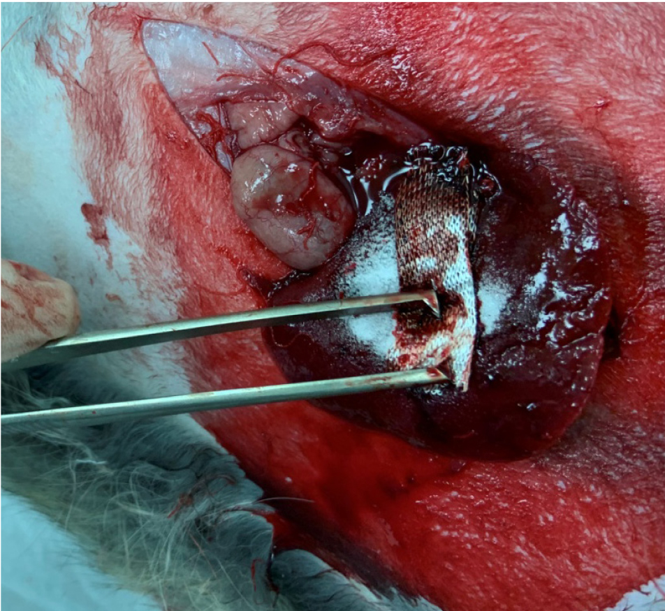 Остановка кровотечения в ОГ производилась путем аппликации раны сорбентом молселект G-50 (4,0 г) с последующим тампонированием полоской гемостатической марли сургитамп (4,0 × 2,0 см) (рис. 2). Хирургический гемостаз в КГ достигался путем прошивания экспериментальной кровоточащей раны печени п-образным швом (нить ПГА 3.0 на основе полигликолевой кислоты) до сближения краев раны (рис. 3).