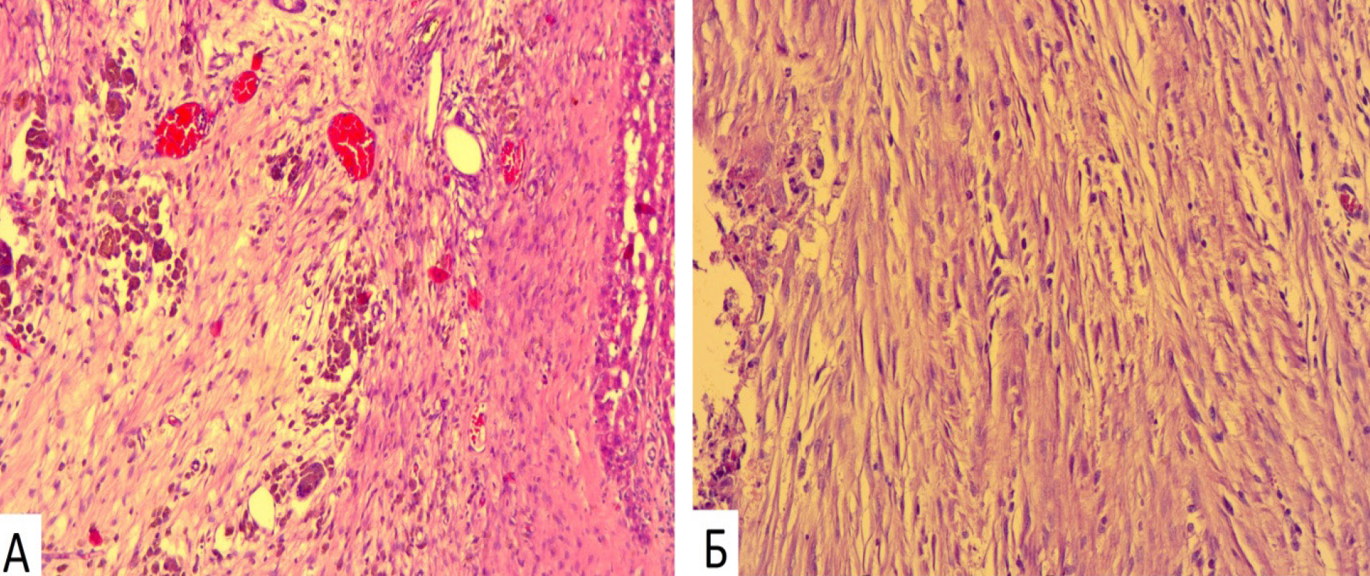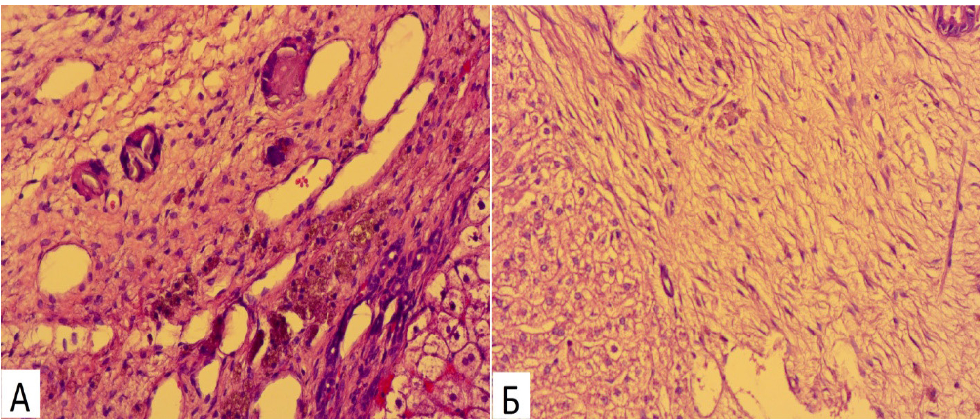На 28-й день эксперимента при анализе морфологических особенностей заживления экспериментальных ран печени наблюдались следующие особенности. В ОГ животных дно раны («зона некроза») было представлено зрелой грануляционной тканью с врастающими печеночными ходами и сосудами. В прилежащих к ране зонах отмечались очаги пролиферирующих молодых гепатоцитов (рис. 6А). В КГ «зона некроза» представляла собой молодую грануляционную ткань с густой лимфо-гистиоцитарной инфильтрацией, отграниченной зрелой соединительно-тканной капсулой. Капсула отделяла ткань печени от очага повреждения. В зоне шовного материала ПГА наблюдалась выраженная гигантоклеточная реакция (рис. 6Б).