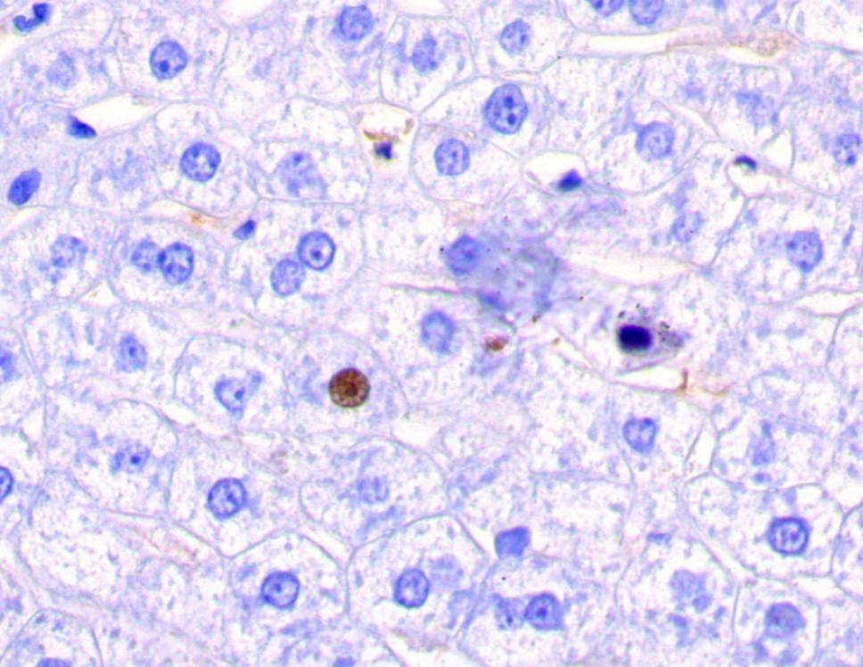 Выведение животных из эксперимента производили на 7, 14 и 28-е сутки путем передозировки наркоза (по 5 животных ОГ и КГ). При аутопсии производили забор ткани печени из области экспериментальных ран с последующим их погружением в 10%-й раствор формалина. Обезвоживание тканей проводили в этиловом спирте возрастающей концентрации, после чего их заливали в парафин. Срезы ткани печени толщиной 5 мкм окрашивали гематоксилин-эозином и пикрофуксином по Ван-Гизону на выявление коллагеновых волокон. Иммуногистохимическое окрашивание применялось для идентификации пролиферирующих клеток по экспрессии антигена Ki-67 печени экспериментальных животных. Первичное антитело – Purified Mouse Anti-Human Ki-67 (клон В56, разведение 1 : 50, производитель BD Biosciences, USA). Вторичное антитело – Biotine mouse anti-rat IgG2b (разведение 1 : 50, производитель Millipore, USA). Идентификация антигенных детерминант осуществлялась непрямым пероксидазным методом окрашивания.