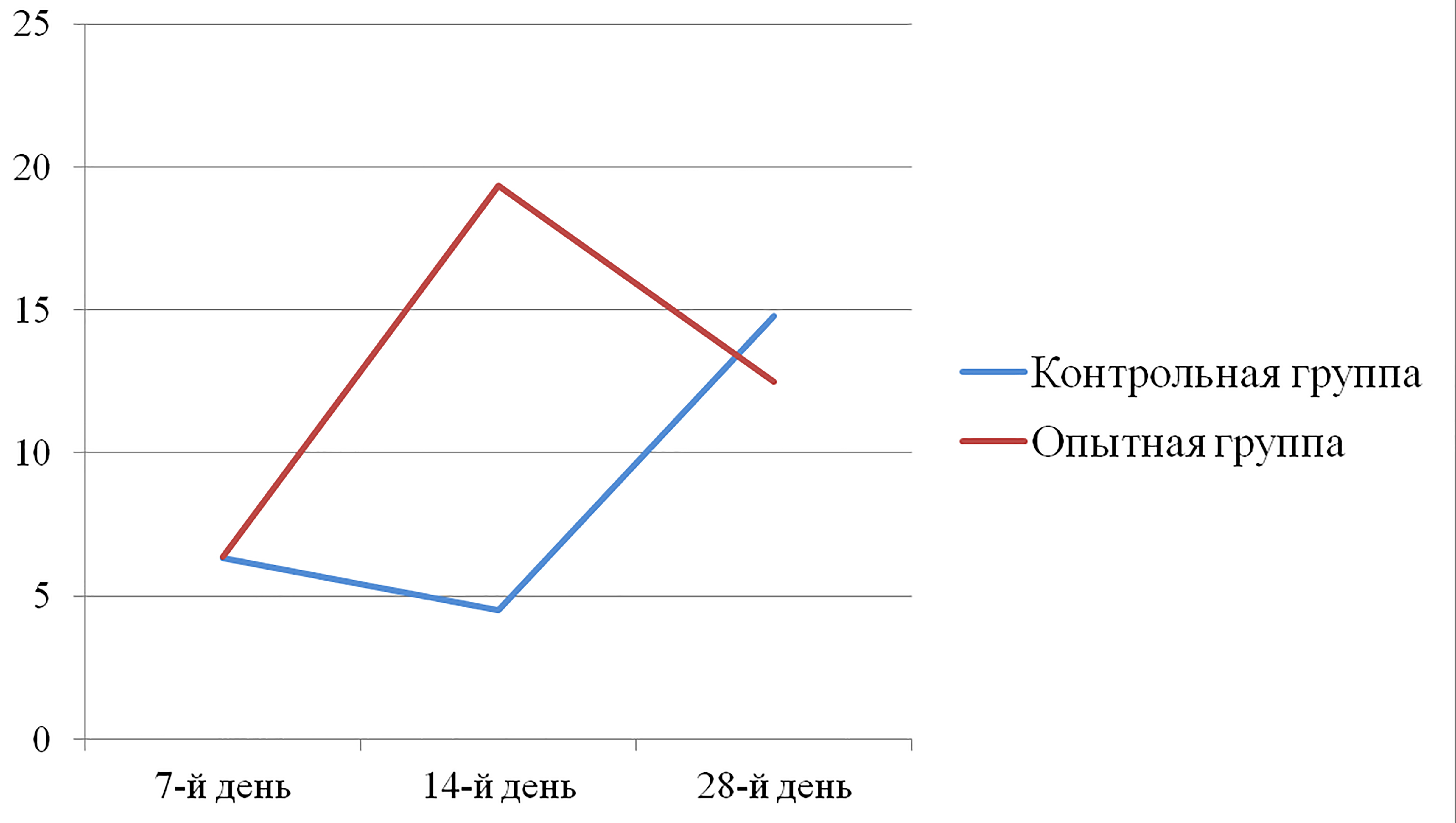 При сравнении этих показателей выявлено статистически достоверное различие ИА на 7-й день экспериментального исследования: ИА в ОГ составил 3,96 ± 1,21, в КГ – 8,39 ± 2,46 (P < 0,05). Наиболее вероятно ИА в КГ на 7-й день был выше из-за ишемических процессов в области контрольных ран, что связано со сдавлением шовным материалом кровоснабжающих зону повреждения сосудов. В ОГ на 14-е сутки ИА находился на уровне 7 дня – 3,83 ± 1,22 (P < 0,05), а к 28-му дню происходило его значительное снижение до уровня 1,92 ± 0,78. В КГ к 14-му дню ИА снижался с 8,39 ± 2,46 до 5,49 ± 1,61 (P < 0,05), а к 28-му дню ИА продолжил снижение и составил 3,78 ± 0,88. Значимость различий ИА в сравниваемых группах на 28-е сутки составила P = 0,001.