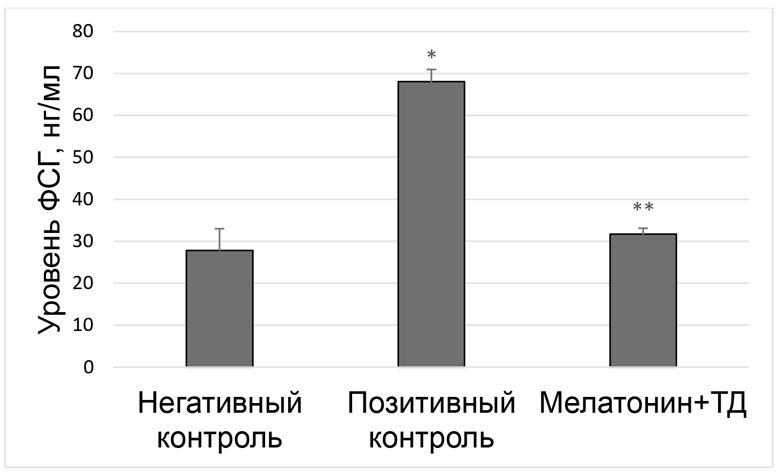 Содержание животных в условиях постоянного освещения в течение 30 сут. (вторая группа – позитивный контроль, животные которой подверглись темновой депривации) приводило к увеличению уровня ФСГ в сыворотке крови в 2,4 раза по сравнению с показателем животных из группы контроля (первая группа – негативный контроль, животные которой не подвергались темновой депривации), p < 0,05 (рис. 1).