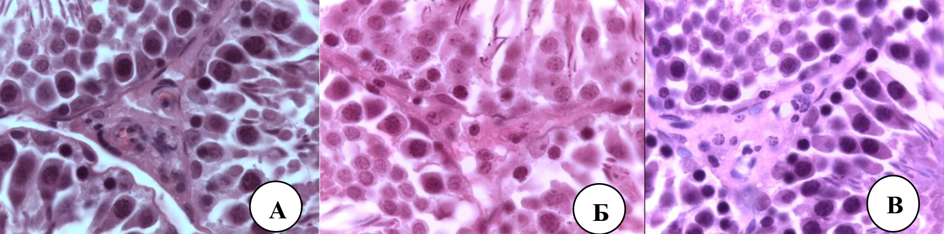 Клетки Сертоли с неправильной и нечеткой формой располагались на базальной мембране извитого семенного канальца, в их цитоплазме визуализировались светлые ядра, округло-овальной формы, смещенные к базальному полюсу, цитоплазма – эозинофильная. Просматривались все этапы сперматогенеза: сперматогонии – на базальной мембране на уровне ядер сустентоцитов, сперматоциты первого порядка в мейозе I, сперматоциты второго порядка, сперматиды округлой формы и небольших размеров. В просвете семенных канальцев определялись сперматозоиды, обращенные головками в сторону апикального полюса сустентоцитов. Наличие всех этапов сперматогенеза указывало на способность яичек вырабатывать сперматозоиды.