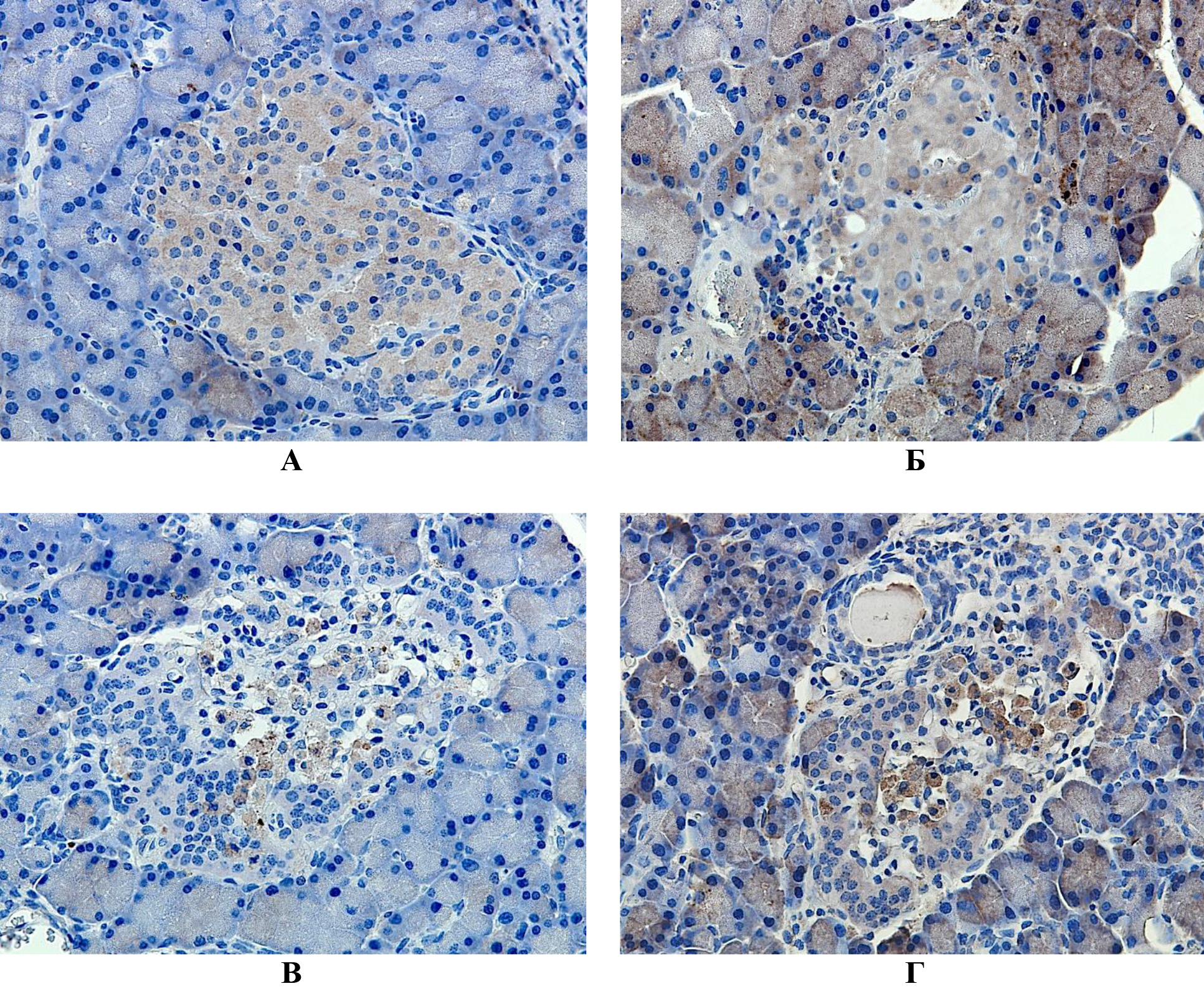 Рис. Иммунолокализация NLRP3 в поджелудочной железе (Антитела к NLRP3. Пероксидазно-антипероксидазный-метод. Ядра окрашены гематоксилином Майера. Ув. ×400): А – интактной крысы; Б – опытной крысы с индуцированным СД; В – опытной крысы, получавшей аминалон до и после индуцированного СД; Г – опытной крысы, получавшей пикамилон до и после индуцированного СД