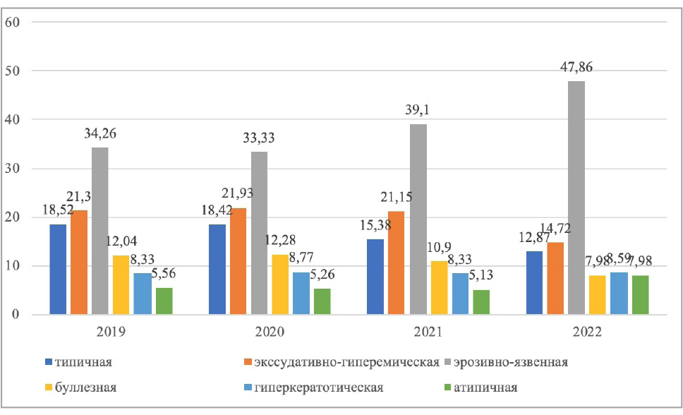 Отмечен прирост распространенности эрозивно-язвенной формы, которую относят к воспалительно-деструктивным патологиям. Если в 2019 г. выявлено (34,26 ± 0,59) % обращений пациентов, а в 2022 г. – (47,86 ± 0,44) %, следовательно, прирост составил 28,42 %, что свидетельствует о развитии осложненных случаев, торпидных к существующим методам лечения. Данный факт также подтвержден уменьшением числа обращений пациентов с типичной формой – на 5,65 %; в 2019 г. – (18,52 ± 0,32) %, в 2022 г. – (12,87 ± 0,37) %.