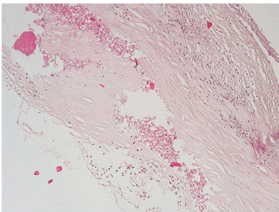 Для гистологического исследования вырезали участок КА в области установки стента и после фиксировали в забуференном 10%-м растворе формалина. Проводка проходила в микроволновом гистопроцессоре закрытого типа Milestone Logos (Италия), с использованием в качестве реагентов спирта изопропилового абсолютированного 99,8 %, орто-ксилола и последующей заливкой в парафиновую смесь «Гистомикс». Гистологические срезы выполняли на автоматизированном ротационном микротоме фирмы Leica (Германия) с предустановленной толщиной срезов 3 мкм. Микропрепараты окрашивали гематоксилином-эозином, заключали под покровное стекло с использованием монтирующей среды «Витрогель». Микроскопия и микрофотографирование осуществлялись на микроскопе Leica DM 1000 (Германия) со встроенной фотокамерой.