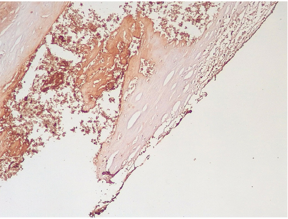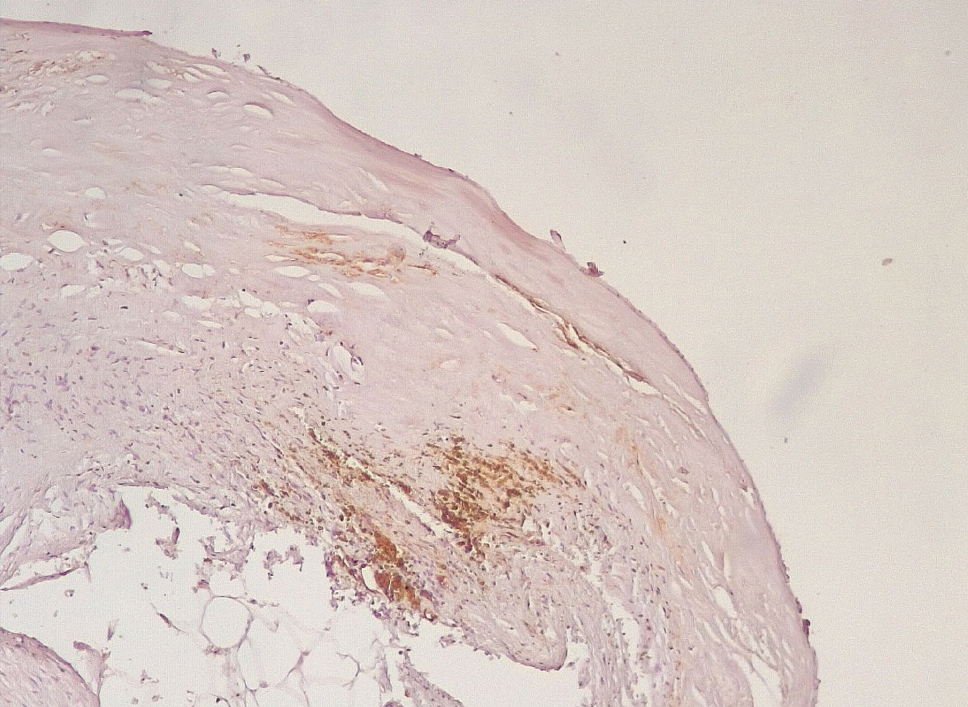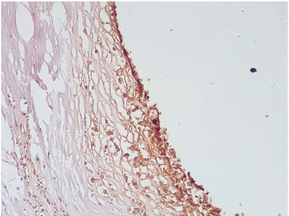 Обращало внимание, что в местах «оголенного» эндотелия КА отмечалась слабая экспрессия белка CD31, что указывало на выраженные дистрофические и некробиотические изменения клеток (рис. 2). При этом экспрессия ФВ была яркой, выраженной на всем протяжении интимы КА (рис. 3).
