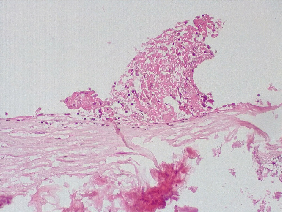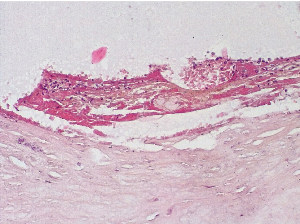 Патоморфологическое исследование стенок КА в ранние сроки после стентирования выявило характерные особенности. В течение первых 3 дней после стентирования в стенке КА имелась атерома с признаками геморрагий. Эндотелий был на большем протяжении разрушен, с признаками десквамации, с окружающей очаговой лейкоцитарной инфильтрацией. Вокруг атеромы, со стороны медии и адвентициальной оболочки, отмечалась умеренновыраженная лимфоцитарная инфильтрация (рис. 1).