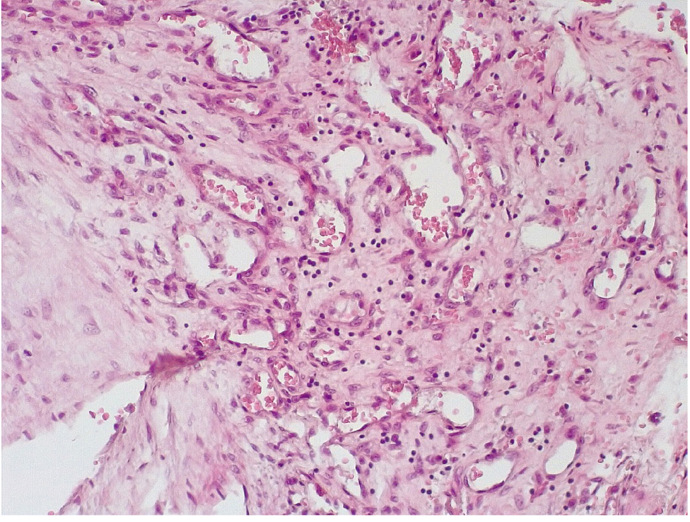 В течение 7–15 суток после стентирования КА наряду с формированием пристеночных фибриновых тромбов с признаками организации в стенках атером наблюдались репаративные процессы, связанные с неоангиогенезом в виде образования мелких тонкостенных кровеносных сосудов капиллярного типа, окруженных мелкими лимфоцитарными, гистиоцитарными клеточными инфильтратами (рис. 6, 7).