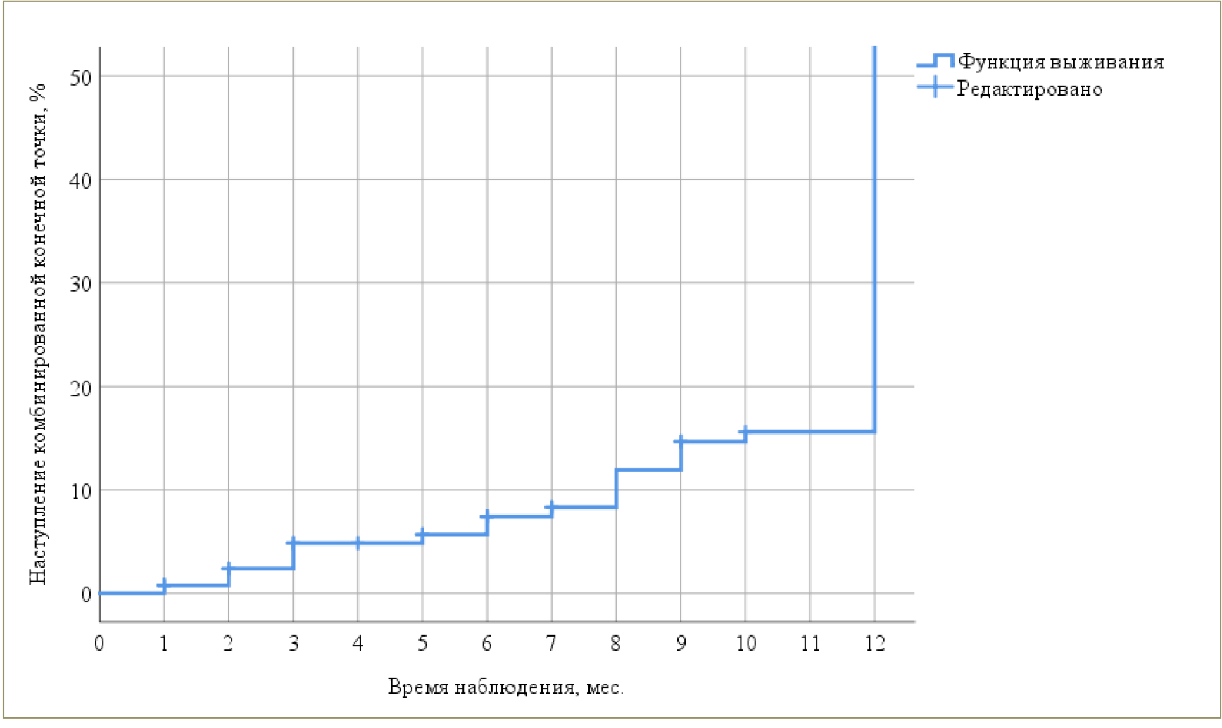 Поскольку повторный ИМ, инсульт и летальность от кардиальных причин имеют этиопатогенетическую взаимосвязь, мы объединили их в комбинированную конечную точку (ККТ). Таким образом, в группе больных ИМ ККТ в течение 12-месячного наблюдения была достигнута у 22 человек (18,5 %).