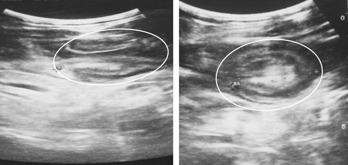 Рис. 3. Ультразвуковая картина инвагинации, инвагинат отмечен белым контуром
