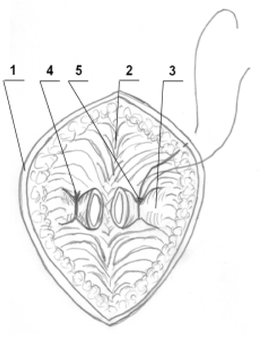 Рис. 4. Схема классической операции LIFT: 1 – разрез перианальной кожи; 2 – межсфинктерное пространство; 3 – проксимальная культя свищевого хода; 4, 5 – перевязка и пересечение фистулы