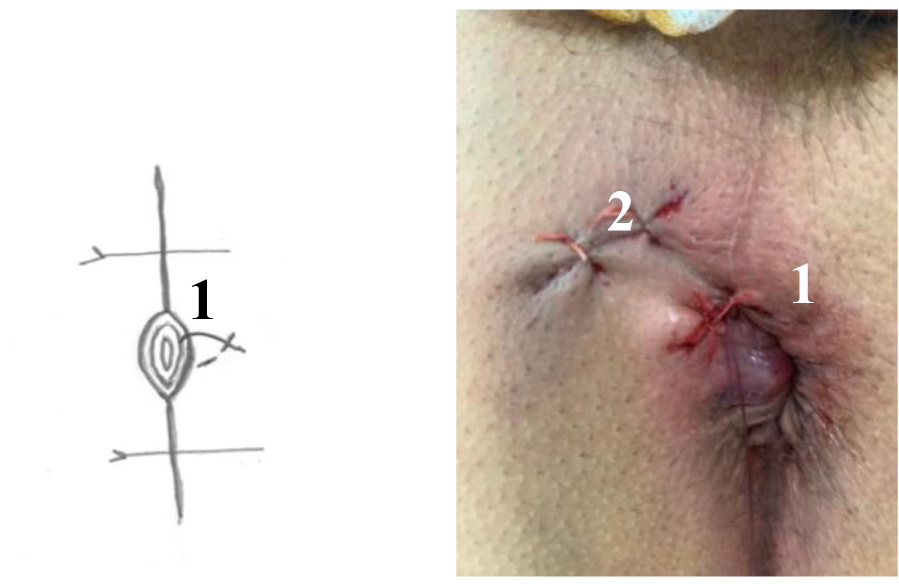 Рис. 7. Модифицированная операция LIFT: 1 – проксимальная культя свищевого хода фиксирована к перианальной коже межсфинктерной раны, 2 – рана после иссечения дистальной части хода ушита