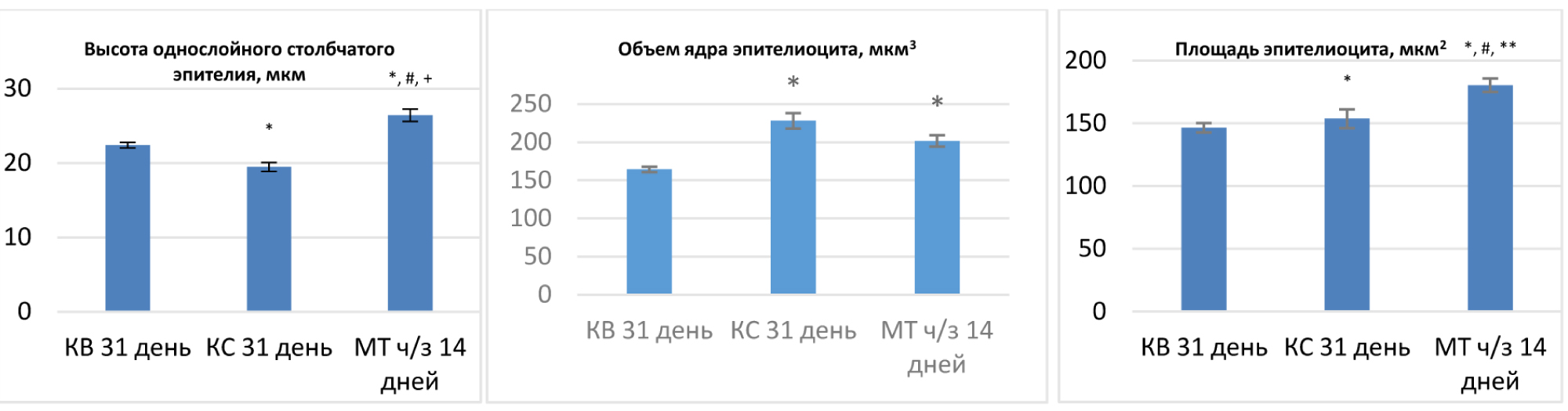 При гистологическом исследовании маточных желез были выявлены следующие изменения: увеличение высоты, площади секреторных эпителиоцитов маточных желез на 13,2 % (p < 0,05) и 30,7 % (p < 0,01) соответственно. Одновременно уменьшается объем их ядер на 10 % (p < 0,01) по сравнению с опытной группой (рис. 2).