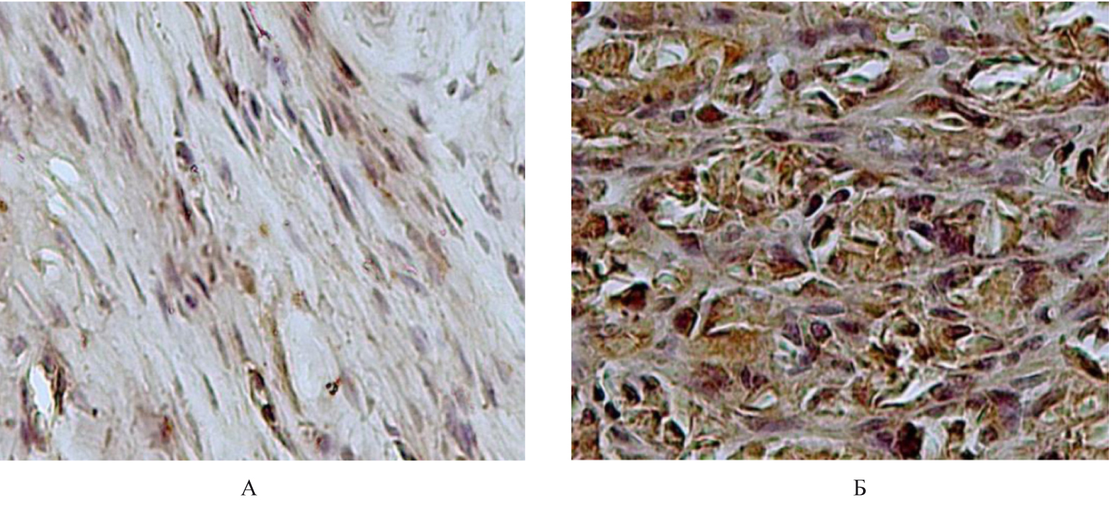 Рис. 2. Гистологическое строение сухожилия крысы из группы: А – иммуногистохимическое исследование антитела против MMP1, докраска гематоксилином Карацци (ув. × 400), Б – иммуногистохимическое исследование антитела против MMP9, докраска гематоксилином (ув. × 400)