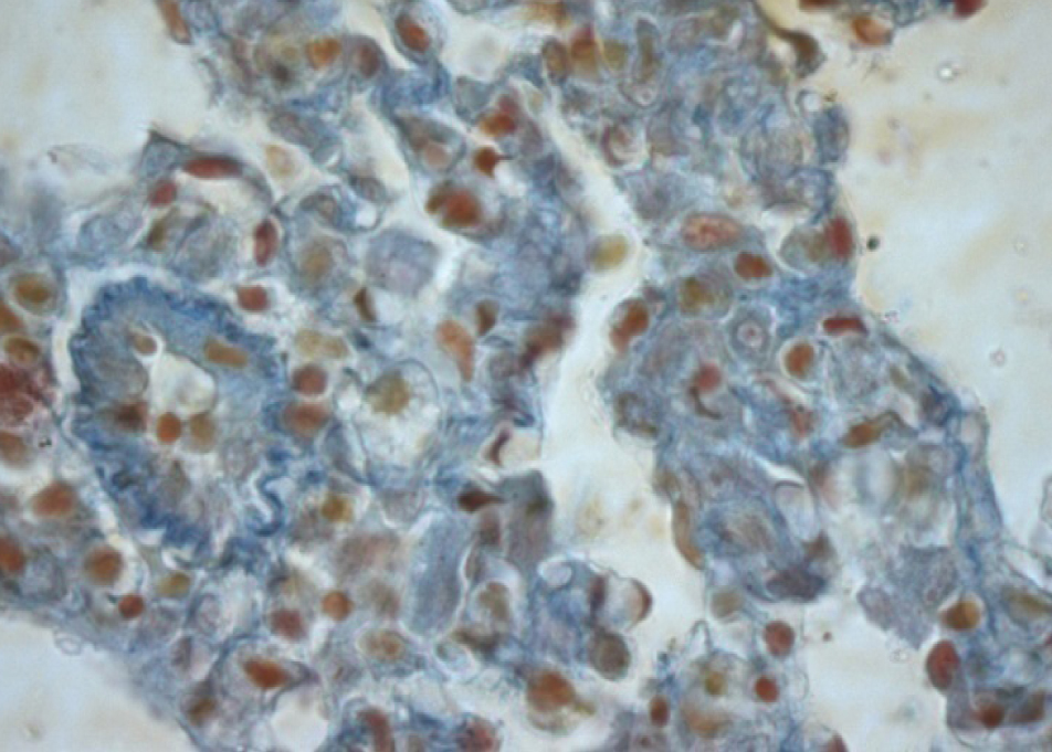 Рис. 7. Отслаивание эпителия в просвет бронхов. Окраска муцикармином Мейера. Ок. 10. Об. 100. Иммерсия