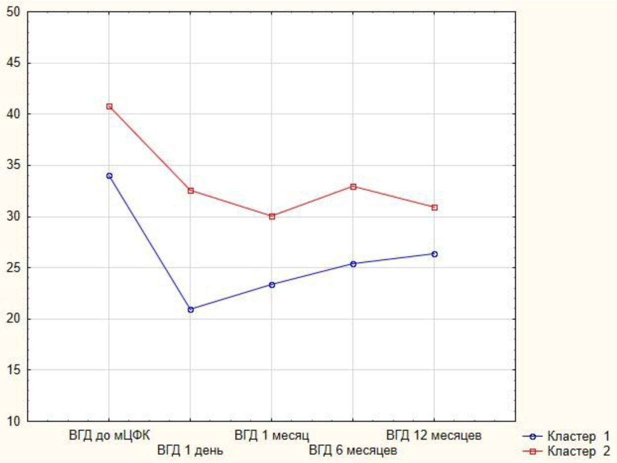 По итогам проведенного кластерного анализа методом k-средних изучаемая выборка была разделена на 2 кластера (рис. 2). В первый кластер вошло 10 наблюдений, во второй – 28 наблюдений. Представленные кластеры отличаются по значениям ВГД и их динамике в послеоперационном периоде. Так, пациенты из первого кластера имели более высокие значения ВГД до и после проведения мЦФК по сравнению с пациентами из второго кластера. Значение убыли ВГД в первый день после операции у пациентов первого кластера ниже, чем у пациентов из второго. Однако у пациентов из 1 кластера сохраняется тенденция убыли ВГД к первому месяцу после мЦФК. Далее отмечается прирост ВГД к 6 месяцам, а к 12 месяцам вновь отмечается тенденция убыли значения показателя. Динамика значений ВГД у пациентов второго кластера схожа с динамикой средних значений, представленных на рис. 1.