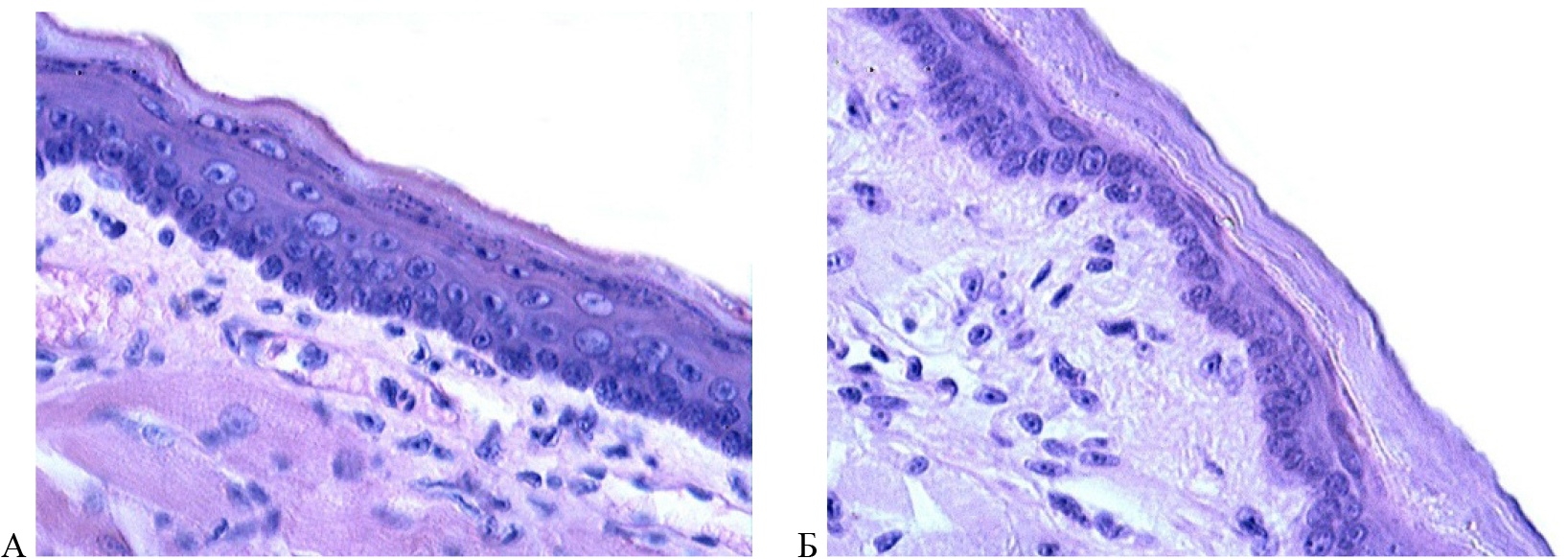 Рис. 1. Слизистая оболочка вентральной поверхности языка: А – контрольная группа, Б – после 3 инъекций ЦФ. Истончение шиповатого слоя и утолщение рогового слоя эпителия. Окраска: гематоксилин – эозин. Ув. × 400