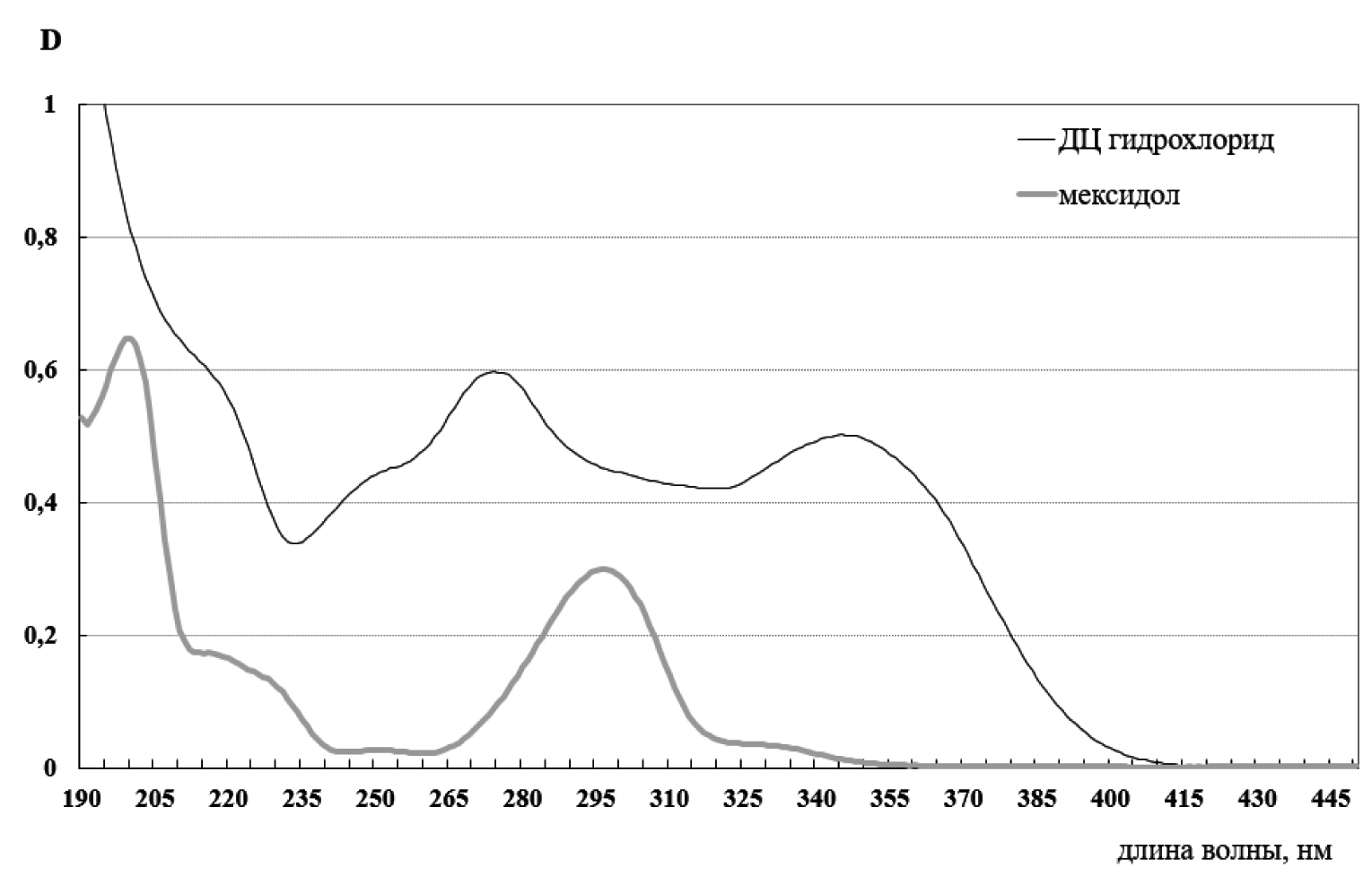 Рис. 1. Спектры поглощения растворов мексидола и доксициклина гидрохлорида