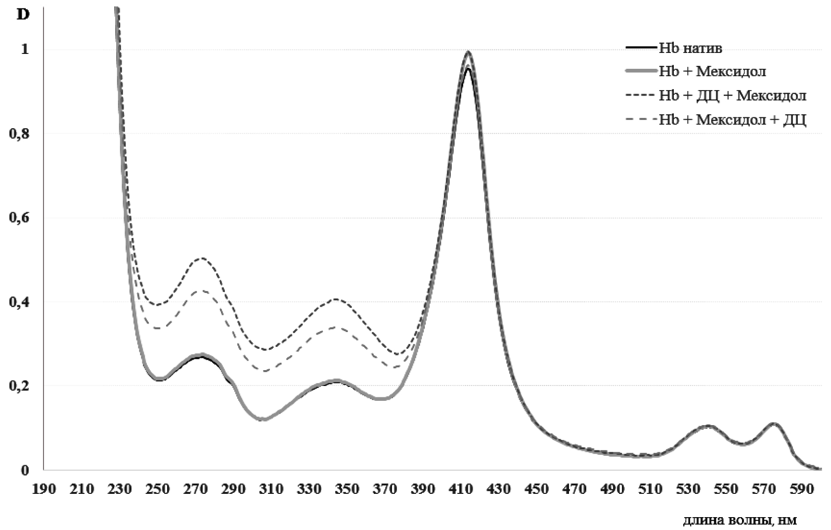 Как следует из представленных данных, мексидол характеризуется наличием четко различимых пиков в области 200, 295 нм, а ДЦ – при 272 и 345 нм. Установлено, что молекулы мексидола не вызывают значительных изменений в молекуле гемоглобина человека (рис. 2).