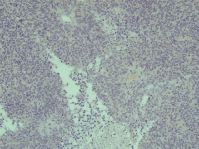 Эстезионейробластома по своей гистологической структуре напоминает лимфосаркому или симпатобластому и представлена комплексами гиперхромных клеток со структурами типа ложных розеток и скудным нейрофибриллярным матриксом, выраженным полиморфизмом [3, 6].