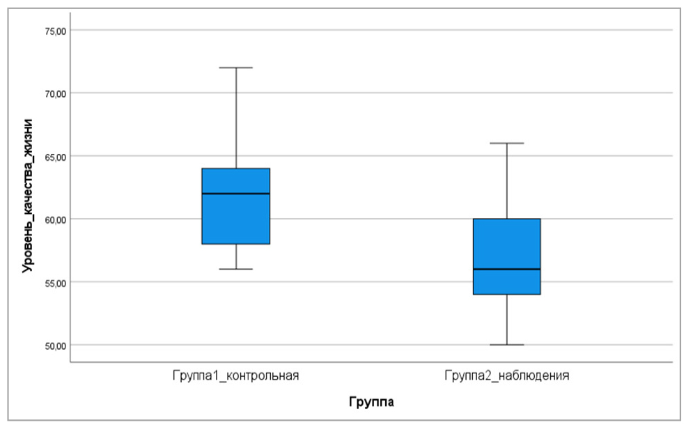 Результаты были представлены в баллах по 8 шкалам, показатели варьировали от 0 до 100. Определялся высокий уровень КЖ – 80 баллов и выше, средний уровень – 59–79 баллов и низкий уровень КЖ – ниже 59 баллов