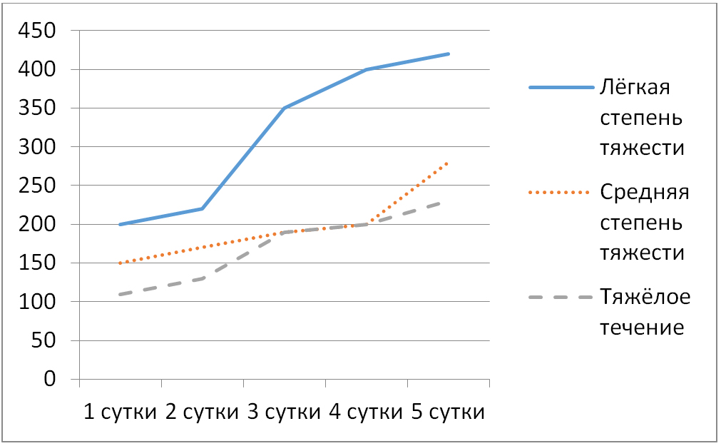 Снижение уровня фермента при легком течении БОП происходило плавно, без резких скачков. При средней тяжести течении БОП уровень альфа-амилазы желчи изначально в среднем составлял (1467,00 ± 143,14) Ед/л (Ме = 1400 Ед/л). Снижение уровня фермента чаще всего (по данным средних показателей посуточного мониторинга) происходило ступенчато со значимыми перепадами на 2-е и 4-е сутки после операции. При тяжелом течении БОП уровень альфа-амилазы желчи изначально в среднем составлял (1880,00 ± 230,43) Ед/л (Ме = 1725 Ед/л). Различия уровня альфа-амилазы желчи статистически значимы между легким и тяжелым течением БОП (p = 0,000011) и не значимы между средней тяжестью и тяжелым течением БОП (p = 0,146275). При тяжелом течении БОП, как и при средней тяжести заболевания, снижение показателей альфа-амилазы происходило ступенчато, с существенными перепадами на 2-е и 5-е сутки после операции. В эти периоды перепадов уровень альфа-амилазы в желчи снижался в среднем на сутки ранее, чем в крови.