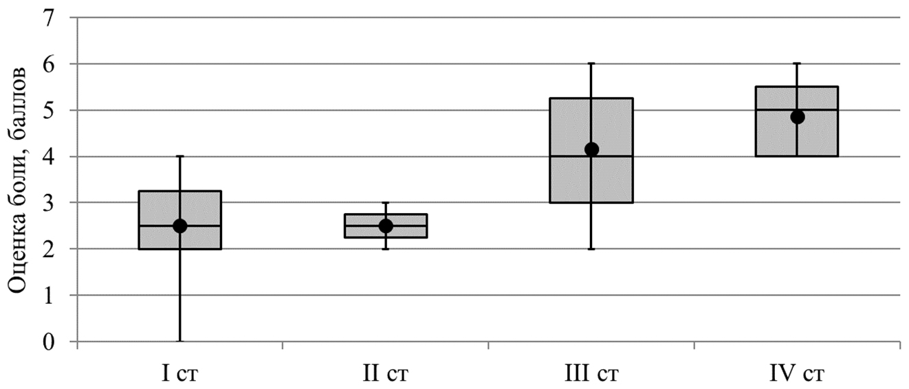 Было проведено непараметрическое множественное сравнение с использованием критерия Данна. Согласно проведенному анализу, дооперационные оценки боли пациентов с I степенью распространения эндометриоза статистически значимо ниже дооперационных оценок боли пациентов с IV степенью распространения эндометриоза. Уровень значимости 0,0085 для каждого из попарных сравнений был рассчитан исходя из общепринятого уровня значимости 0,05. Других статистически значимых различий дооперационных оценок по ВАШ не установлено (рис. 1, табл. 1).