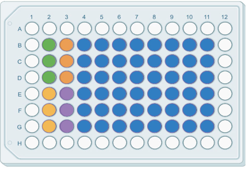 Рис. 2. Схема 96-луночного культурального планшета. Белым цветом обозначены краевые лунки, зеленым – интактные, желтым – ЛПС-контроль, оранжевым – ЛПС+АТФ-контроль, фиолетовым – лунки препарата сравнения, синие – опытные