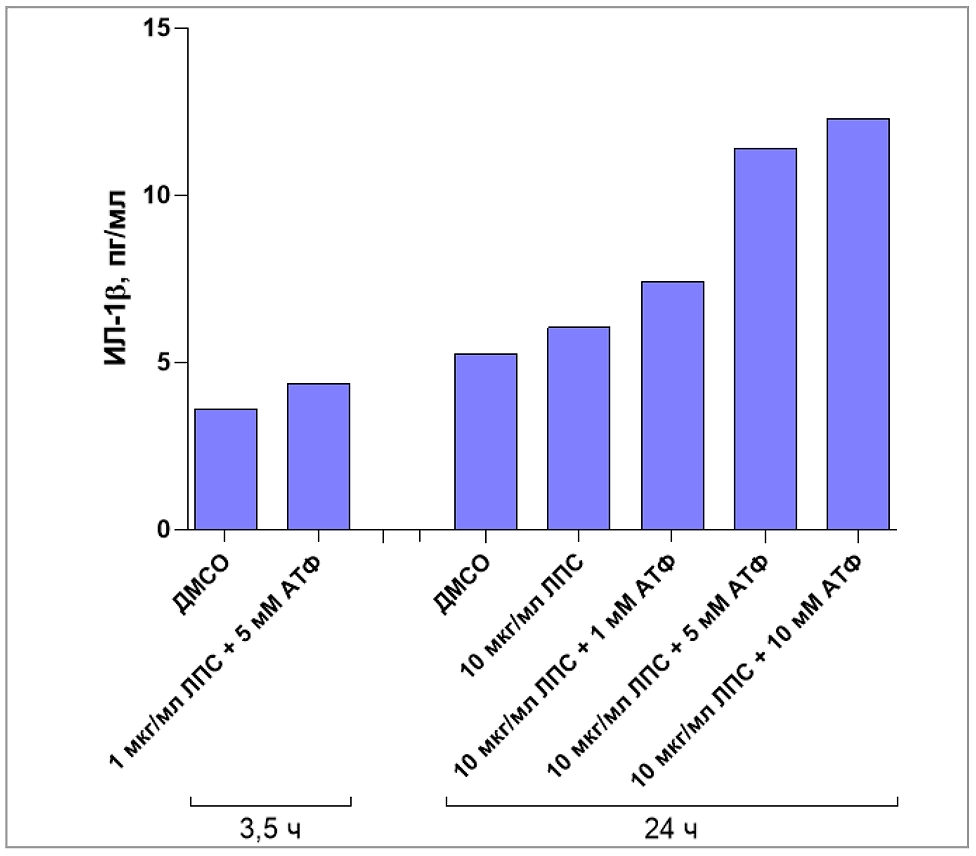 Определили влияние различных факторов на продукцию ИЛ-1β, таких как продолжительность стимуляции макрофагов (время инкубации) и конечная концентрация ЛПС и АТФ в питательной среде. Показано, что наиболее оптимальной является 24-часовая обработка клеток 10 мкг/мл ЛПС. При этом последующая активация инфламмасом раствором АТФ в конечной концентрации 5 мМ существенно увеличивает продукцию интерлейкина. Напротив, при концентрации 1 мМ АТФ в питательной среде эффект менее выражен, а использование более концентрированных растворов (10 мМ) не дает значимого прироста продукции ИЛ-1β, что, по-видимому, свидетельствует о достижении клетками «метаболического максимума» (рис. 3).