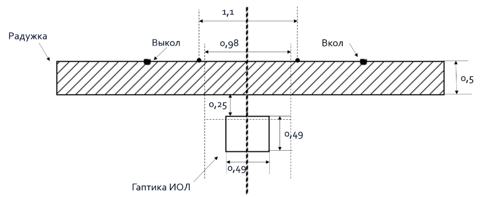 Рис. 1. Модель ИОЛ Tecnis, прямая линия – ось цилиндра ТИОЛ, соответствующая оси шовной фиксации, пунктиром обозначена оптимальная дистанция для шовной фиксации