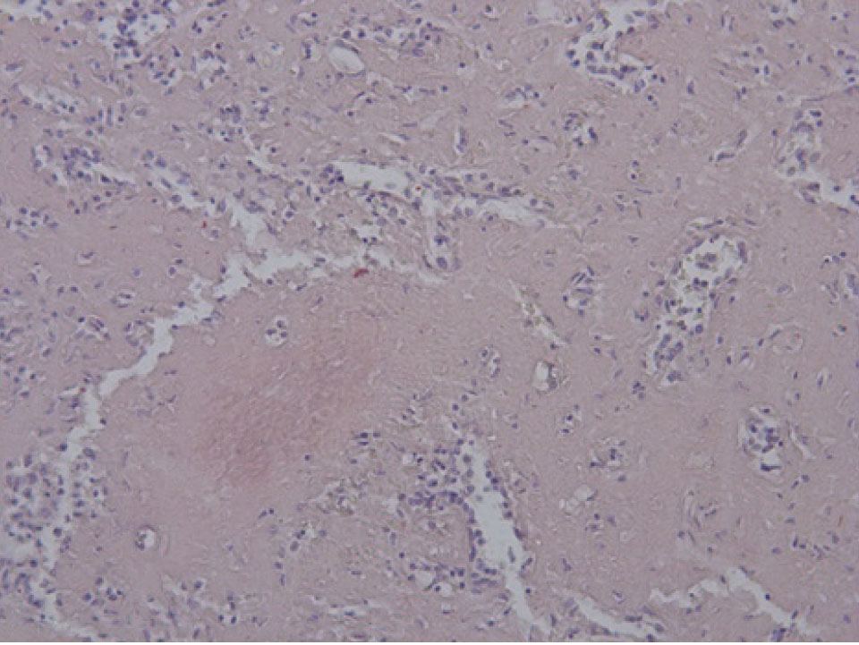 Гистологическое исследование. Сердце – кардиомиоциты гипертрофированы, диффузный кардиосклероз. При окраске на амилоид в строме и стенке сосудов отложение амилоидных масс (рис. 1). Селезенка – красная пульпа полностью замещена однородными массами, дающими положительную окраску на амилоид (рис. 2).