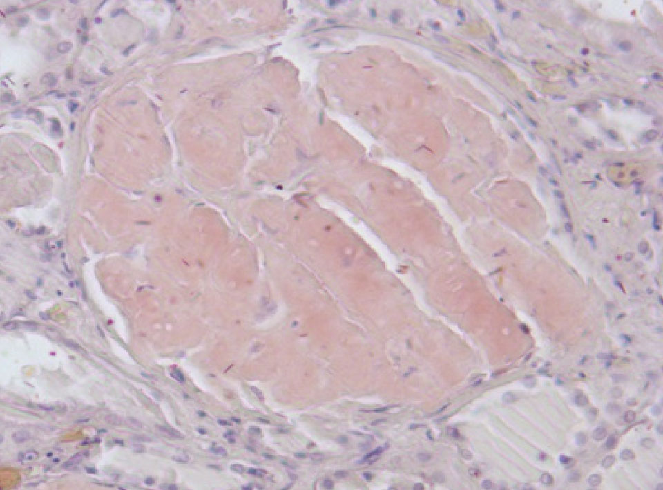 Почки – резкое уменьшение числа клубочков, отдельные полностью замещены однородной массой, дающей положительную реакцию на амилоид (рис. 3). В стенке сосудов также видны отложения амилоида (рис. 4).