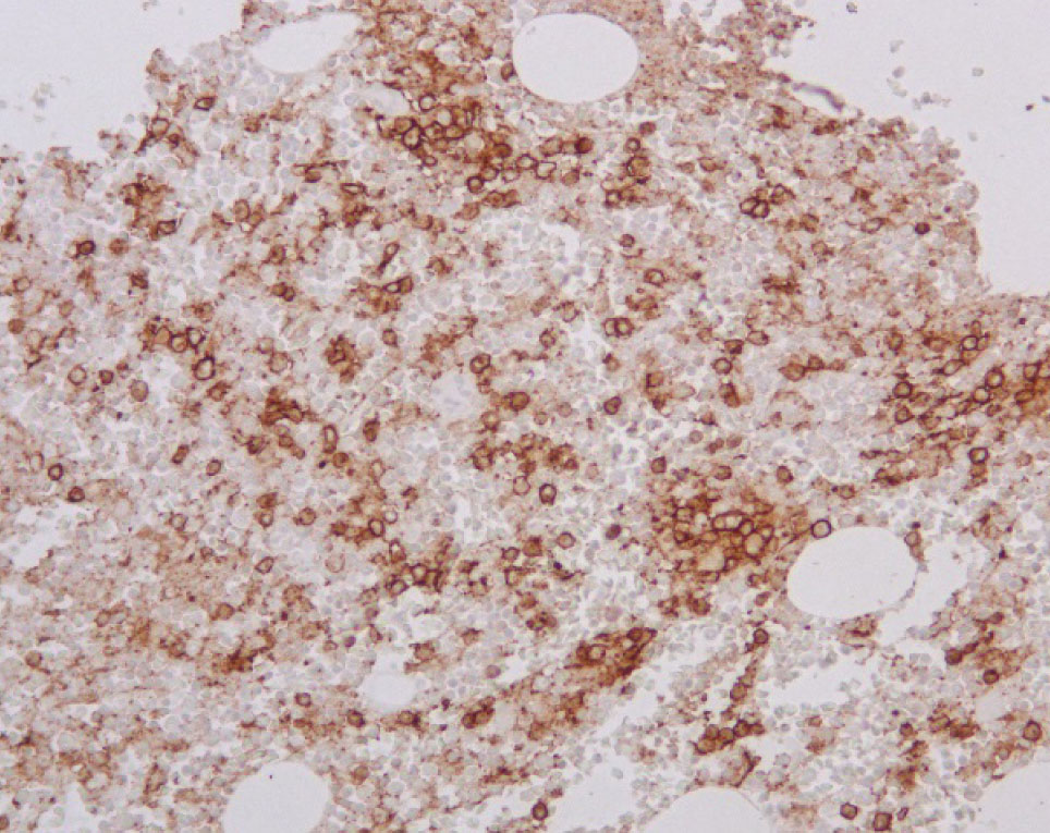 Рис. 6. Экспрессия CD38 в плазматических клетках костного мозга, ×200