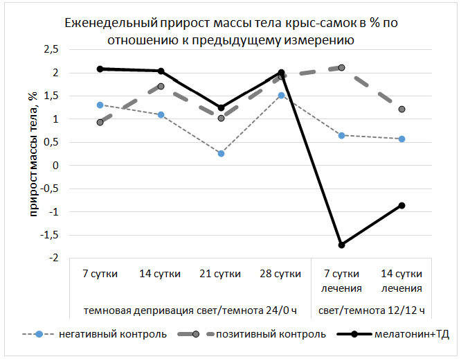 На 21-е сут. эксперимента у животных на фоне темновой депривации выявлено снижение темпа прироста массы тела (1,02 и 1,25 %, группы позитивного контроля и опытная соответственно) по сравнению с показателем крыс из группы негативного контроля, однако различия не были статистически значимыми. По окончании темновой депривации на 28-е сут. темп прироста массы тела у крыс группы позитивного контроля и опытной составил 1,92 и 2,02 % соответственно. На фоне приема мелатонина на 7-е сутки после окончания темновой депривации темп прироста массы тела приобрел отрицательные значения и составил –1,7 %, на 14-е сут. –0,85 %; также было выявлено снижение массы тела на 1,7 и 2,5 % на 7-е и 14-е сут. соответственно.