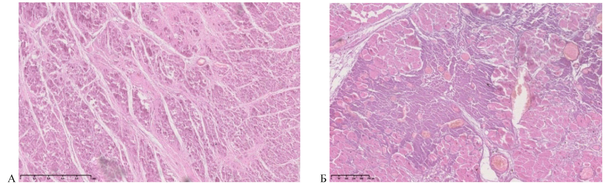Рис. 1. Срез стенки сердца мужчины 67 лет (инфаркт миокарда) (А). Срез стенки сердца женщины 65 лет (повторный инфаркт миокарда) (Б). Окрашено гематоксилином и эозином.