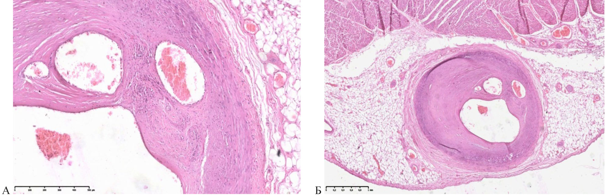 Рис. 2. Срез стенки кровеносного сосуда эпикарда. Окрашено гематоксилином и эозином. Увеличение ×200 (А), ×400 (Б)