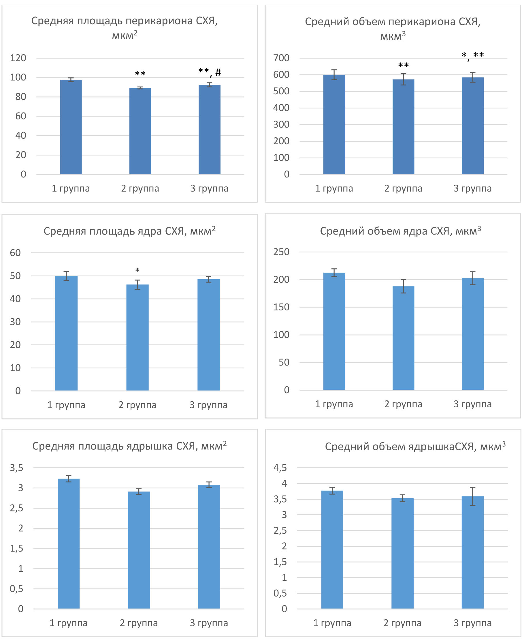 По результатам эксперимента световой десинхроноз в виде круглосуточной темновой депривации на протяжении 30 сут. привел к статистически значимому незначительному уменьшению средней площади и объема перикарионов СХЯ на 8,6 % (p < 0,001) и 4,6 % (p < 0,001) соответственно. Также отмечено статистически достоверное снижение площади и объема ядра на 7,6 % (p < 0,05) и 11,6 %. Выявлено уменьшение морфометрических параметров ядрышек СХЯ: площади и объема на 9,9 и 5,8 % соответственно (рис. 1), однако эти изменения не были статистически достоверными.