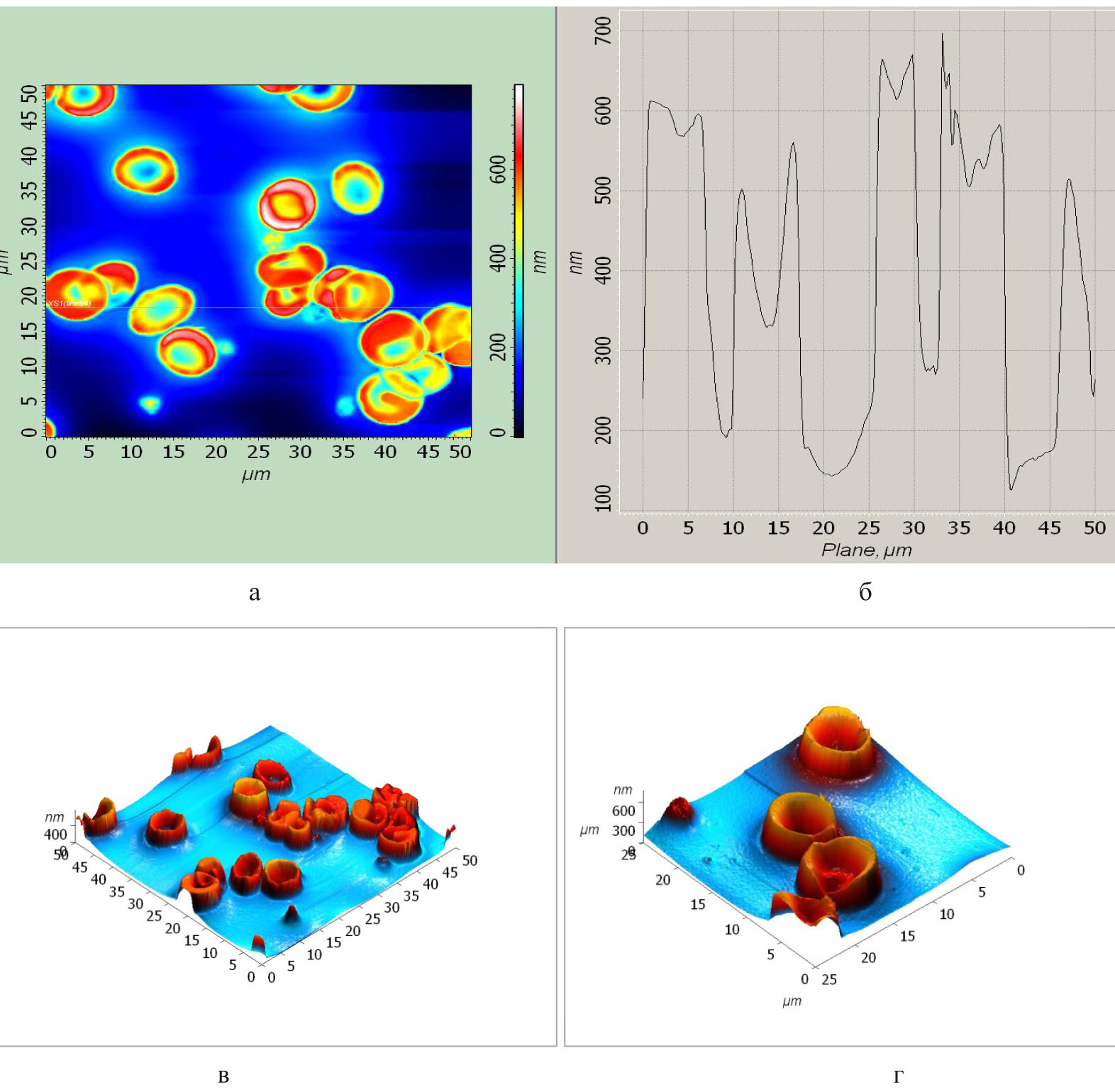 При изучении эритроцитов с применением АСМ было отмечено, что у пациентов контрольной группы они имели дисковидную биконическую форму с умеренной глубиной полости (рис. 1). При этом площадь сечения частицы на уровне половины высоты эритроцита составляла (44,1 ± 3,3) μm2, объём – (4,69 ± 0,41) μm3, значение локального максимума – (0,52 ± 0,08) μm, периметр сечения – (33,22 ± 1,40) μm, эффективный диаметр, определяемый как диаметр окружности, площадь которой равна площади сечения – (7,41 ± 1,39) μm (табл.). Это были в основном дискоциты, в виде овала, преимущественно свободно располагающиеся.