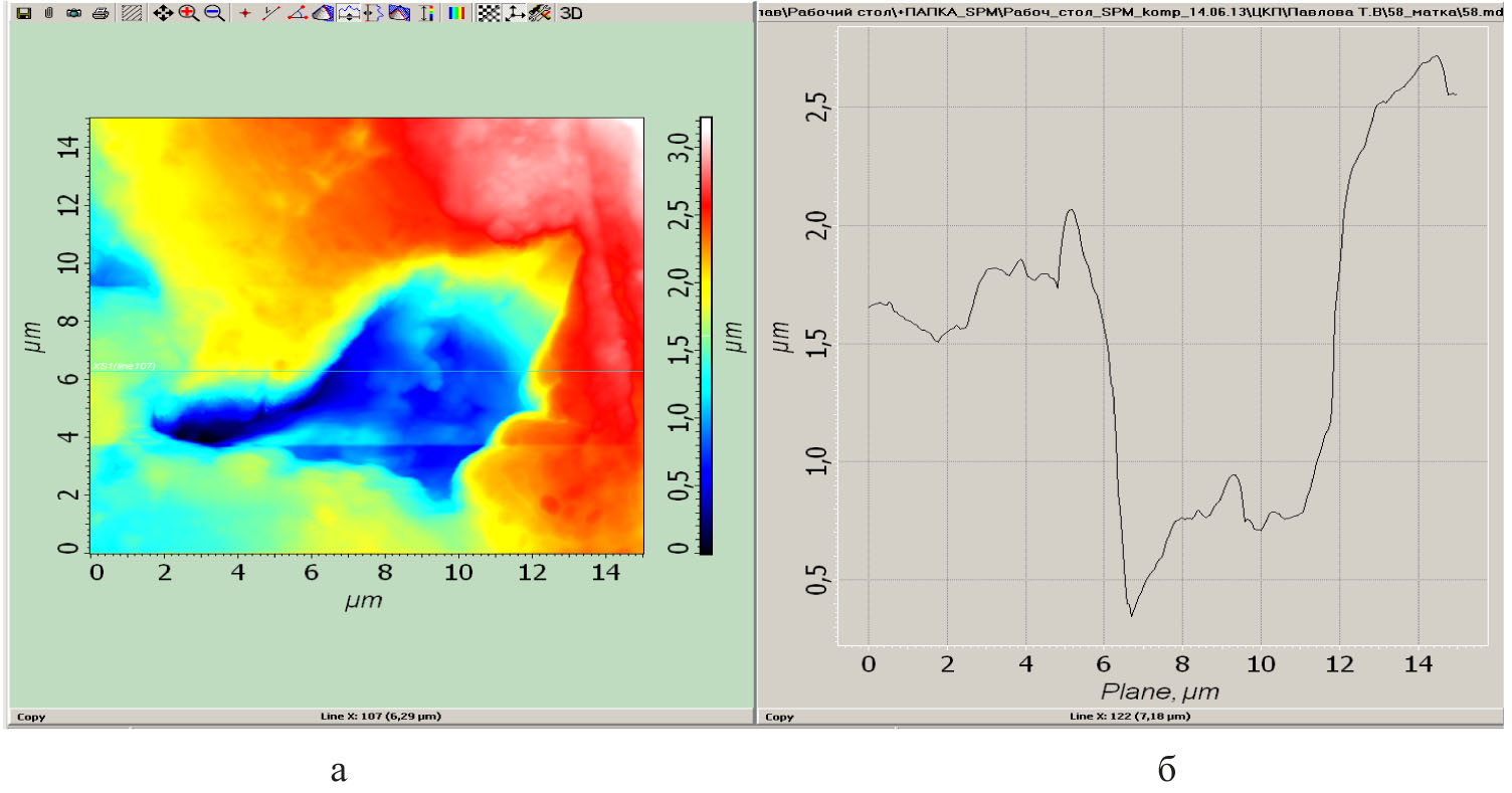 При топографическом анализе наружной части эмали зуба больных с СД 2-го типа с применением АСМ нами было выявлено нарушение поверхности, не выявляемое макроскопически, с нарушением микрорельефа, даже без наличия кариеса, когда зубы удалялись в связи с патологической подвижностью (рис. 2). Цемент был в виде хорошо выраженных волокон, которые представляют собой коллагеновые фибриллы. При трехмерной визуализации ткани зуба при СД видна разница его структуры в сравнении с интактными образцами. При эндокринопатии наблюдались изменения в виде дефектов поверхности корня, выраженного бугристого рельефа. Причем такие поражения при данной патологии могут быть и при отсутствии поверхностного кариеса. Поверхностная часть корня зуба покрыта от шейки до верхушки слоем бесклеточного цемента. Данной слой находится в пределах от 21 до 38 мкм. Клеточный цемент занимает меньшую площадь: от 0,92 до 1,31 мм в контрольной группе. У людей с СД этот участок был меньше – от 14 до 29 мкм. Наиболее характерной особенностью при СД является утончение и даже потеря цементного слоя в верхней трети корня, что ведет к оголению дентина (рис. 2).