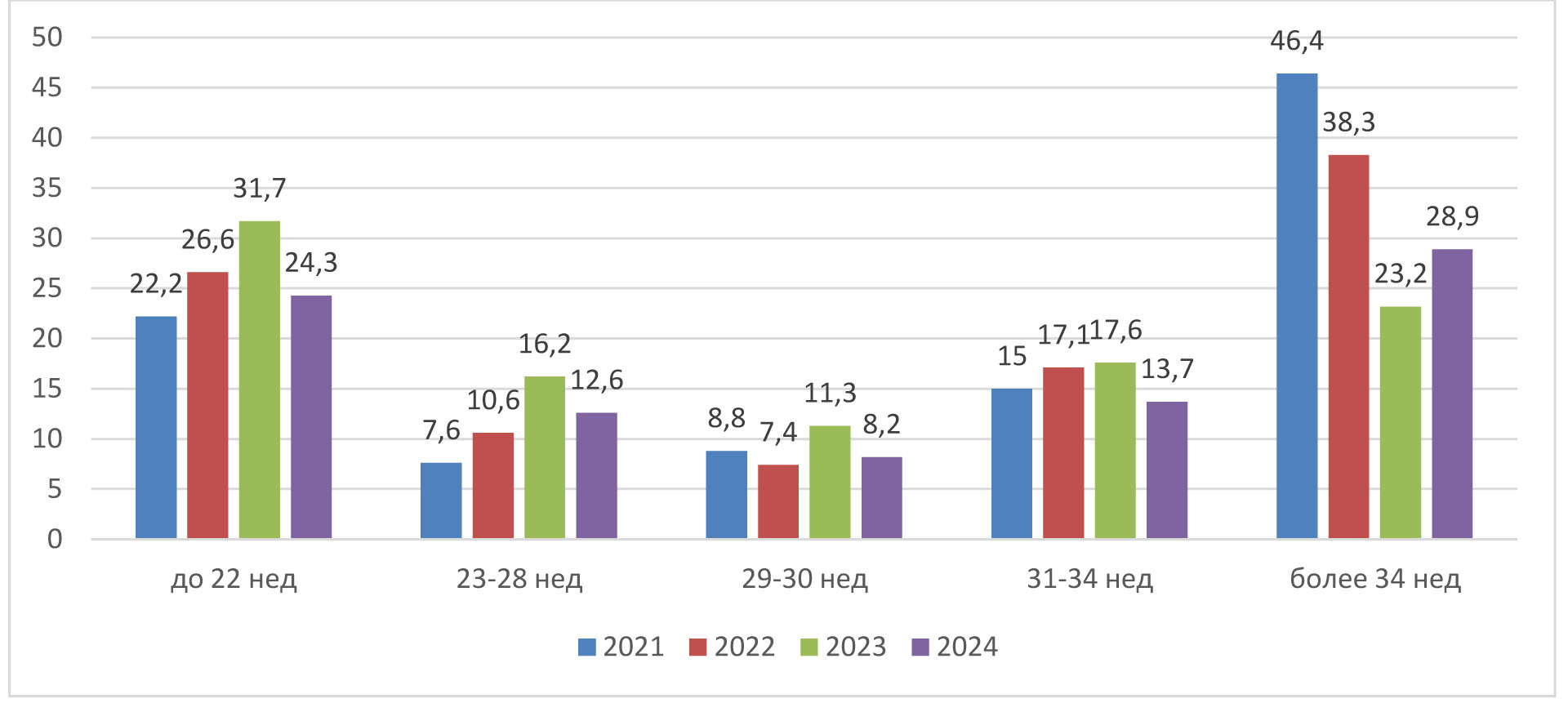 Рис. 4. Распределение пациенток по сроку беременности, %